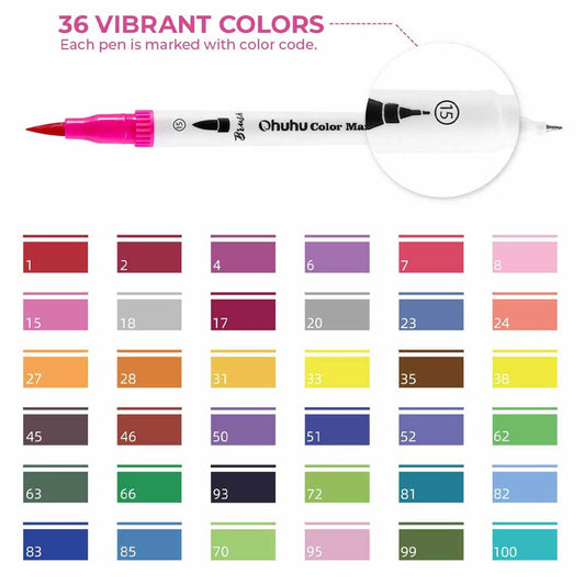 36 MARCADORES DOBLE PUNTA PINCEL Y TIRALÍNEAS FINO "OHUHU"